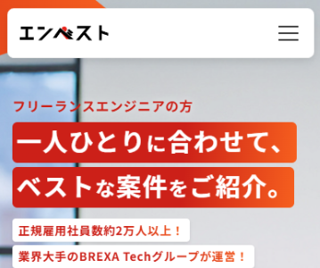 エンベストは、高単価案件を豊富に扱うIT・機電系特化のフリーランスエージェント。専門性の高いスキルを正当に評価してもらえる点が支持されています。