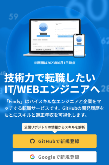 Findyは、GitHubでの活動を「スキル偏差値」として可視化できるエンジニア特化型の転職サービス。数値化されたスキルをもとに企業から直接スカウトが届く、ユニークな仕組みが特徴です。