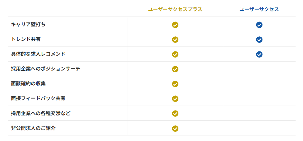 「ユーザーサクセスプラス」は、通常のユーザーサクセスに加えて、企業へのポジションサーチや面談確約の紹介、面接フィードバックの回収、非公開求人の紹介が受けられる無料のサポートです。年収や条件面の交渉も担当者が代行してくれます。