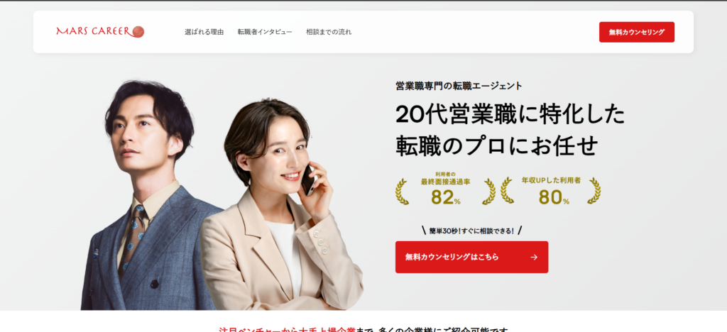 一番の強みは「営業職専任チーム」によるサポートです。業界に精通したキャリアアドバイザーが担当し、応募先に合わせた書類添削・面接対策を個別に対応してくれます。マイナビグループが持つ企業ネットワークを活かした独占求人も保有しており、一般公開されていない案件にアクセスできるのも魅力です。