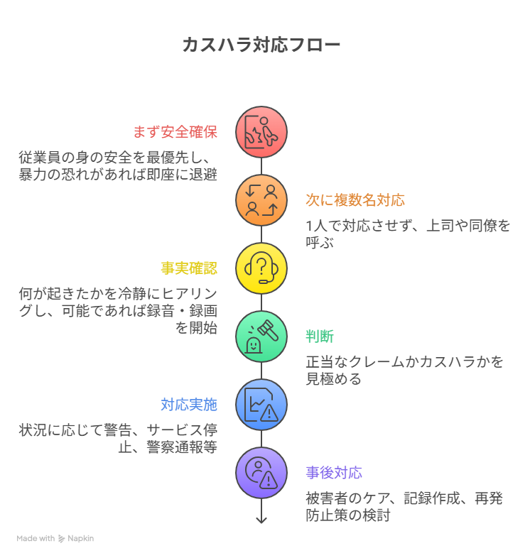 カスハラが疑われる状況が発生したら、まず安全確保(従業員の身の安全を最優先し、暴力の恐れがあれば即座に退避)、次に複数名対応(1人で対応させず、上司や同僚を呼ぶ)、そして事実確認(何が起きたかを冷静にヒアリングし、可能であれば録音・録画を開始)、判断(正当なクレームかカスハラかを見極める)、対応実施(状況に応じて警告、サービス停止、警察通報等)、事後対応(被害者のケア、記録作成、再発防止策の検討)という流れを明確に示します。