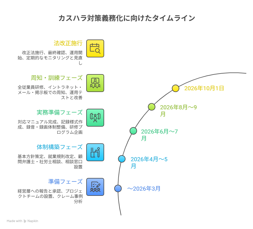 2026年10月1日の施行まで残り約9ヶ月となりました。企業が取り組むべきスケジュールイメージは次のとおりです。