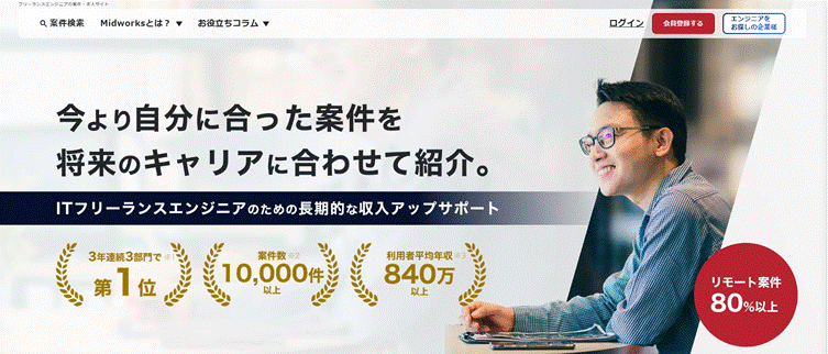 経験が2〜3年で、まだ実績に自信が持てない方が、安定した基盤の上でフリーランスとしての第一歩を踏み出すために最適なサービスです。レバテックで高単価を狙いつつ、Midworksで安定を確保する、という併用方法をおすすめします。