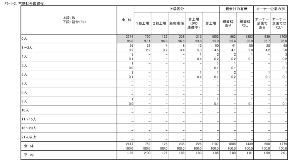 理由としては、常勤であれば従前から社内の体制やカルチャーを熟知していることが望ましいという点が考えられます。もっとも、IPO準備中の非上場企業では、選任していないか、1人選任していることが大多数であることがわかります。