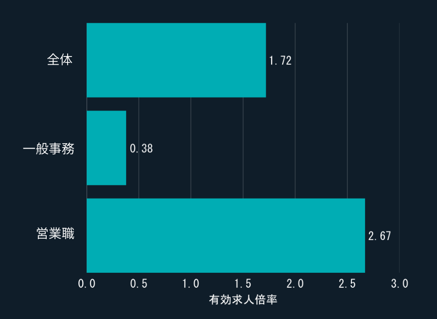 一般事務職は0.38倍と、1つの採用枠を複数の希望者で争う厳しい状況です。一方、営業職は2.67倍で、1人に対して2〜3件の求人から選べる売り手市場が続いています。