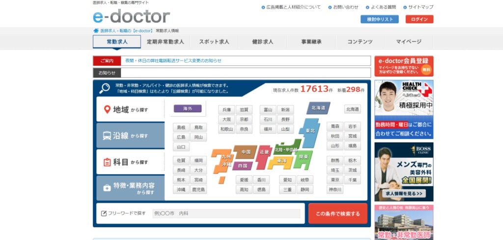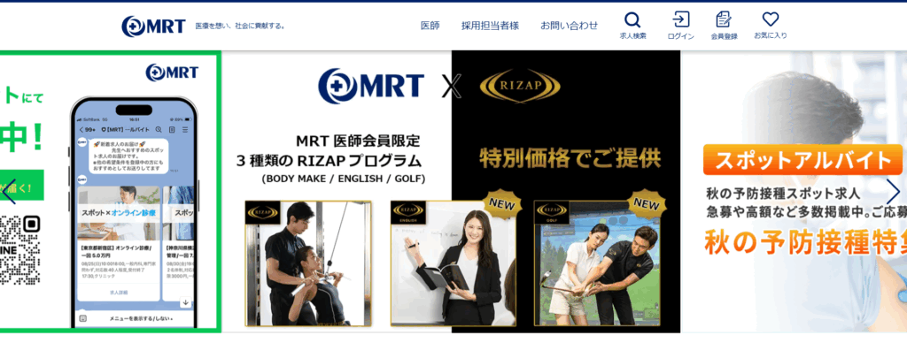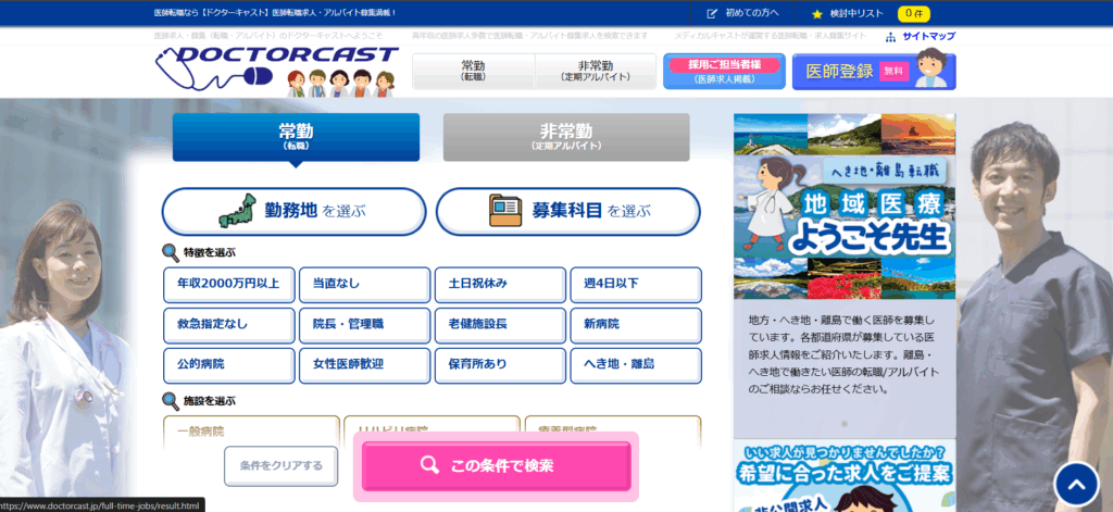 常勤の転職支援はもちろんのこと、非常勤(スポット・アルバイト)の求人数が業界トップクラスであることが大きな特徴です。全国17の拠点網を活かした地域密着型のサポートにも定評があり、医師賠償責任保険といった付帯サービスも充実しています。
