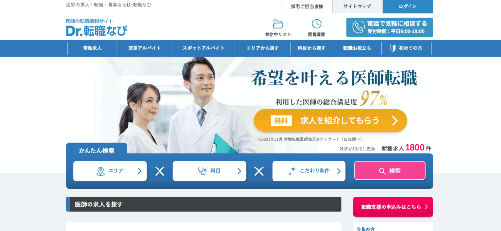 マイナビDOCTORは、大手人材会社マイナビが運営しており、全国の豊富な求人と転職活動全般をカバーする手厚いサポート体制が魅力です。