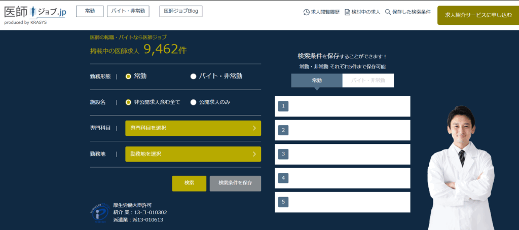 医師である兄が再就職として利用し私も相談に乗りました。 マイナビドクターの特徴として他の医師向け転職サイトから比べると非公開求人が多いという印象を受けました。 非公開求人は公開求人より条件が良い傾向にあり、また求人が殺到しないというメリットがあるので大いに活用できるツールだと思いました。