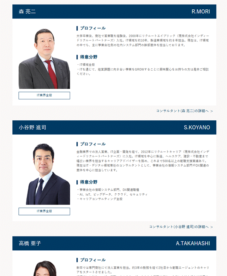 公式サイトでは、IT・ハイキャリア領域を担当するコンサルタントの実績や得意分野が公開されています。