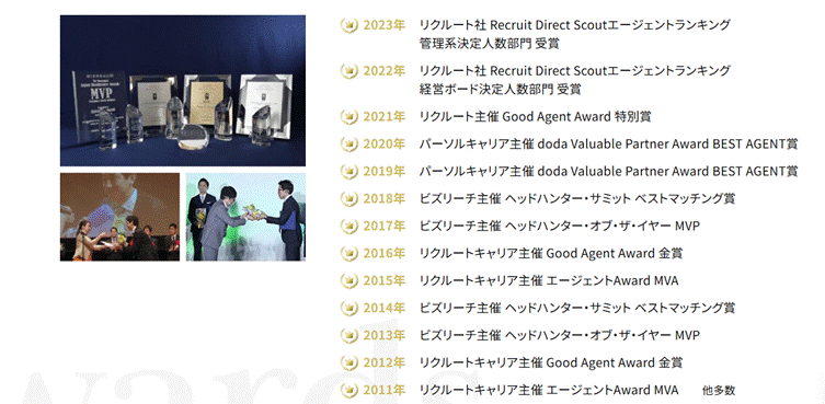 実力を裏付けるのが、13年連続の外部アワード受賞歴です。ビズリーチ・リクルート・パーソルキャリアの大手3社すべてから表彰されており、業界内での信頼度はトップクラスです。