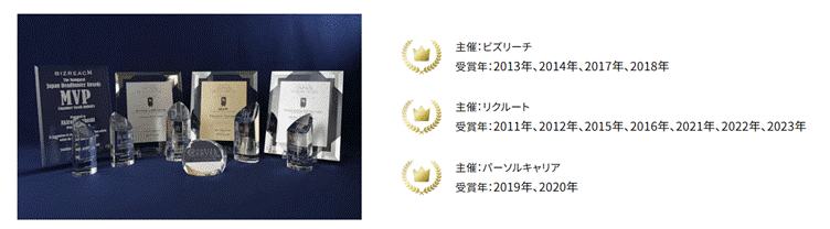 | 受賞歴 | 13年連続 外部アワード受賞(ビズリーチ・リクルート・パーソルキャリア) |