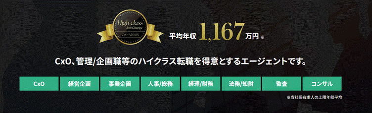 保有求人の平均年収は1,167万円で、CxO・経営企画・事業企画・M&Aなど管理職以上のポジションだけを扱っています。