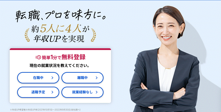 年収アップを目指すなら登録はマスト。レジュメを登録しておくだけでスカウトがくるから、待ってるだけでOK。 |