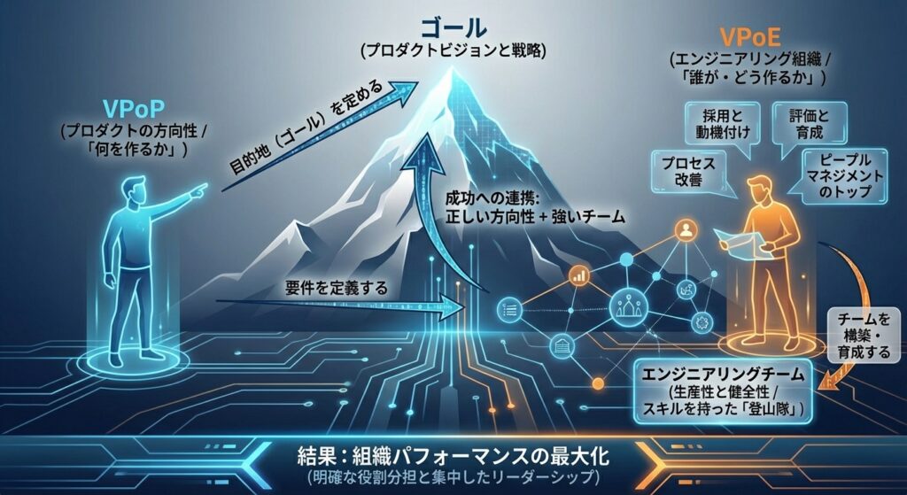 VPoPが「この山(目標)に登りたい」と方針を示します。それに対し、VPoEは「その山に登るためには、これだけの人数と装備(スキル)を持った登山隊(チーム)が必要だ」と判断し、チームを編成・育成します。